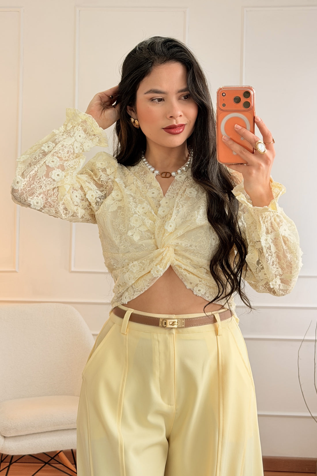 Esta blusa em tom creme é um verdadeiro destaque para qualquer ocasião especial. Com detalhes...
