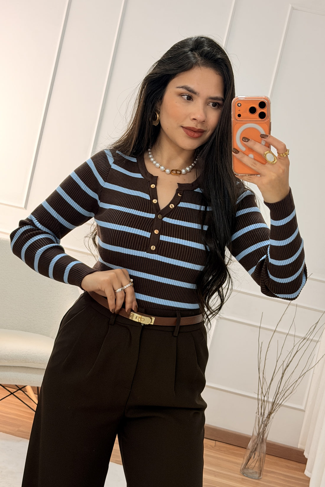Top justo com detalhe tipo corset que realça a silhueta. Mangas compridas em tecido confortável...