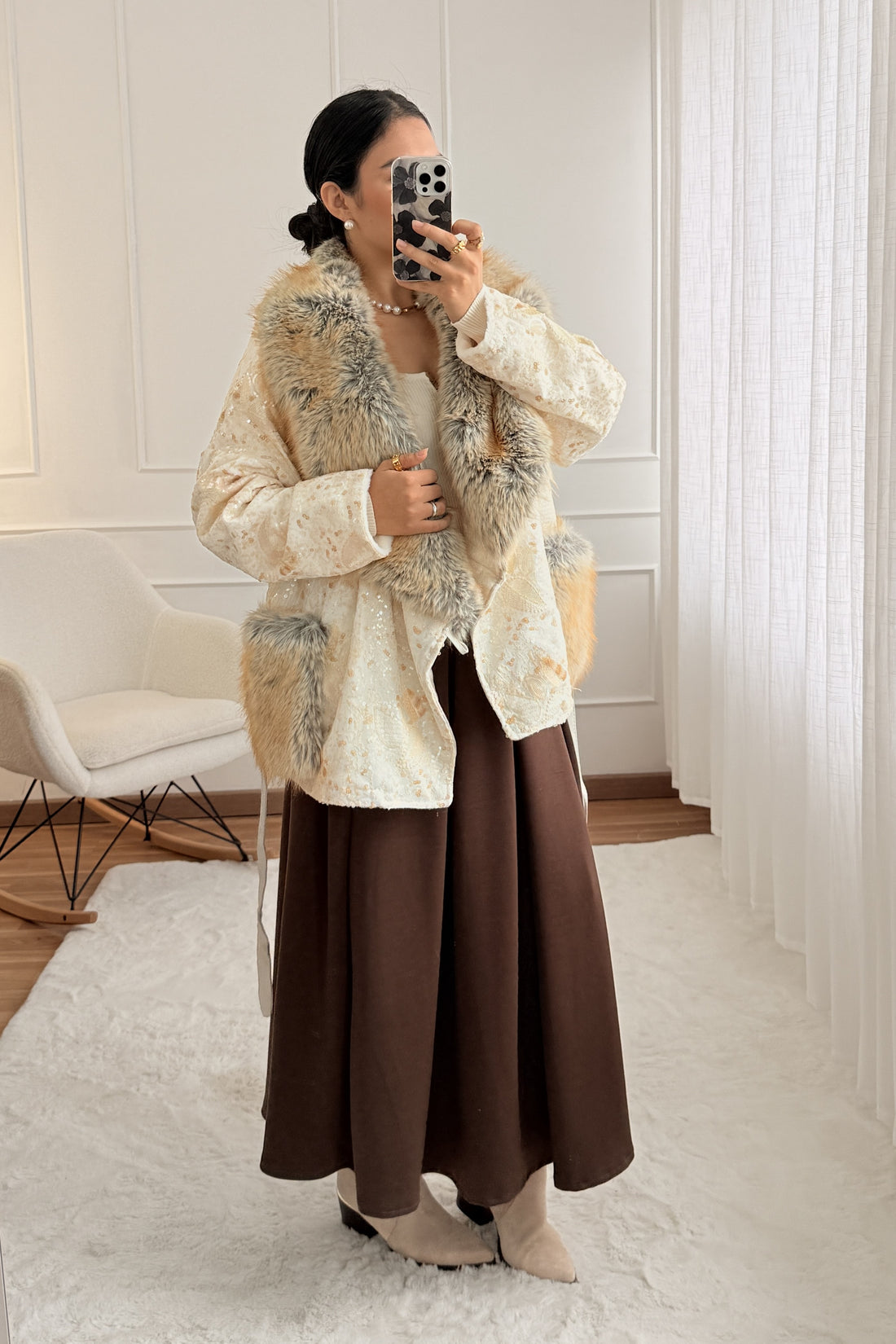 Casaco de corte reto, com gola ampla e punhos em pelo macio. Fecho frontal oculto...