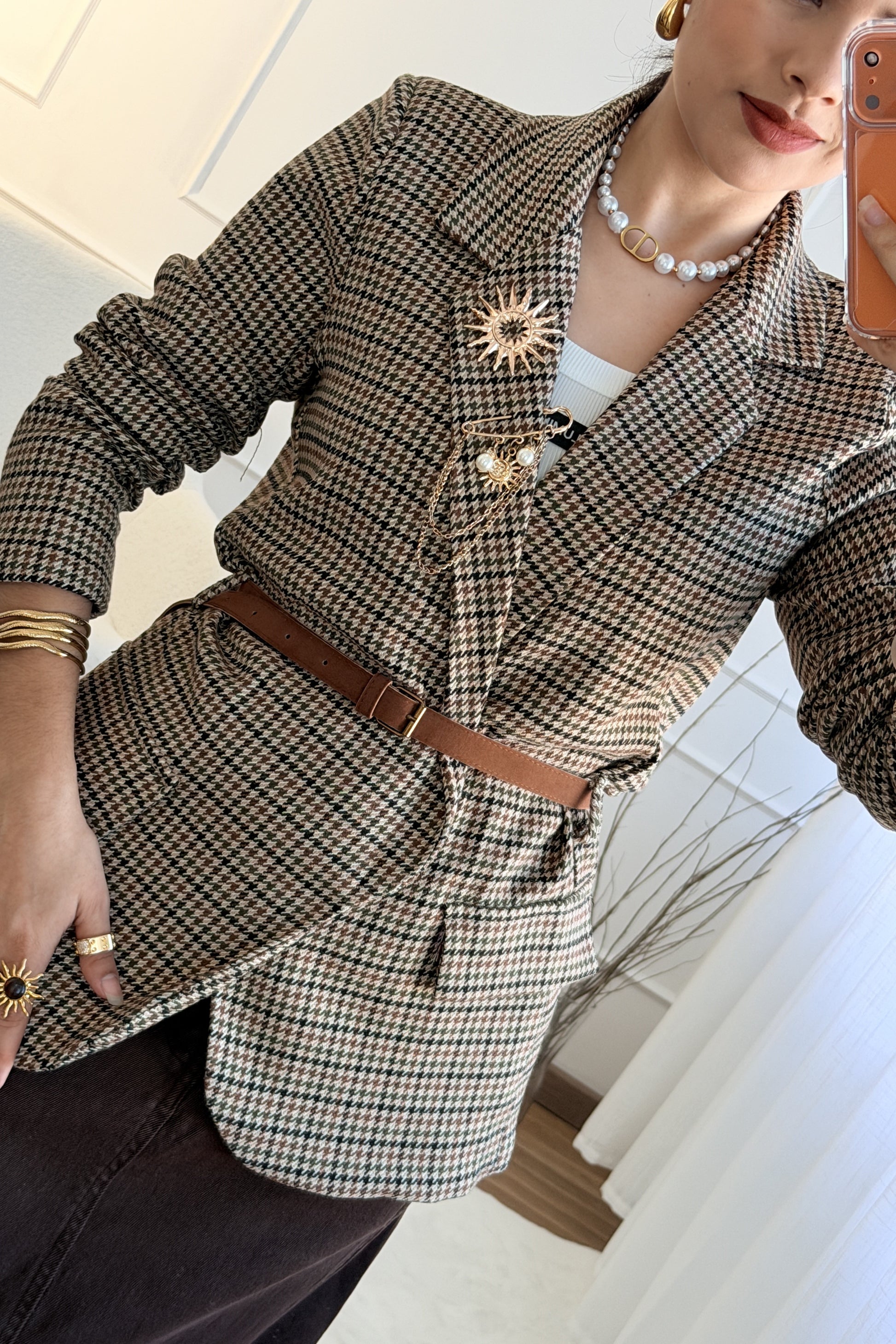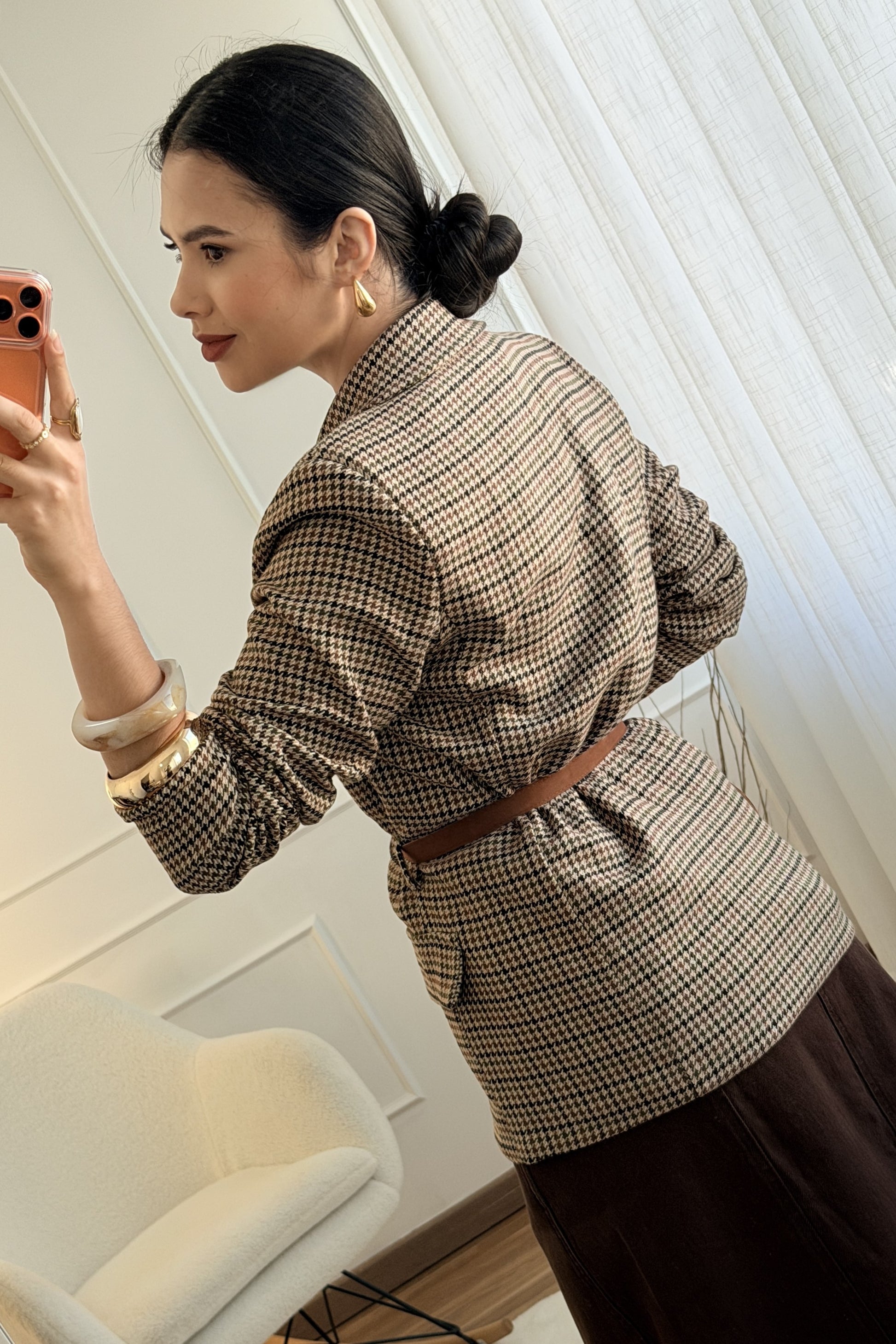 Blazer em padrão pied-de-poule, com corte clássico e elegante. Inclui cinto no mesmo tecido para marcar a cintura. Tecido com ligeira elasticidade para maior conforto.