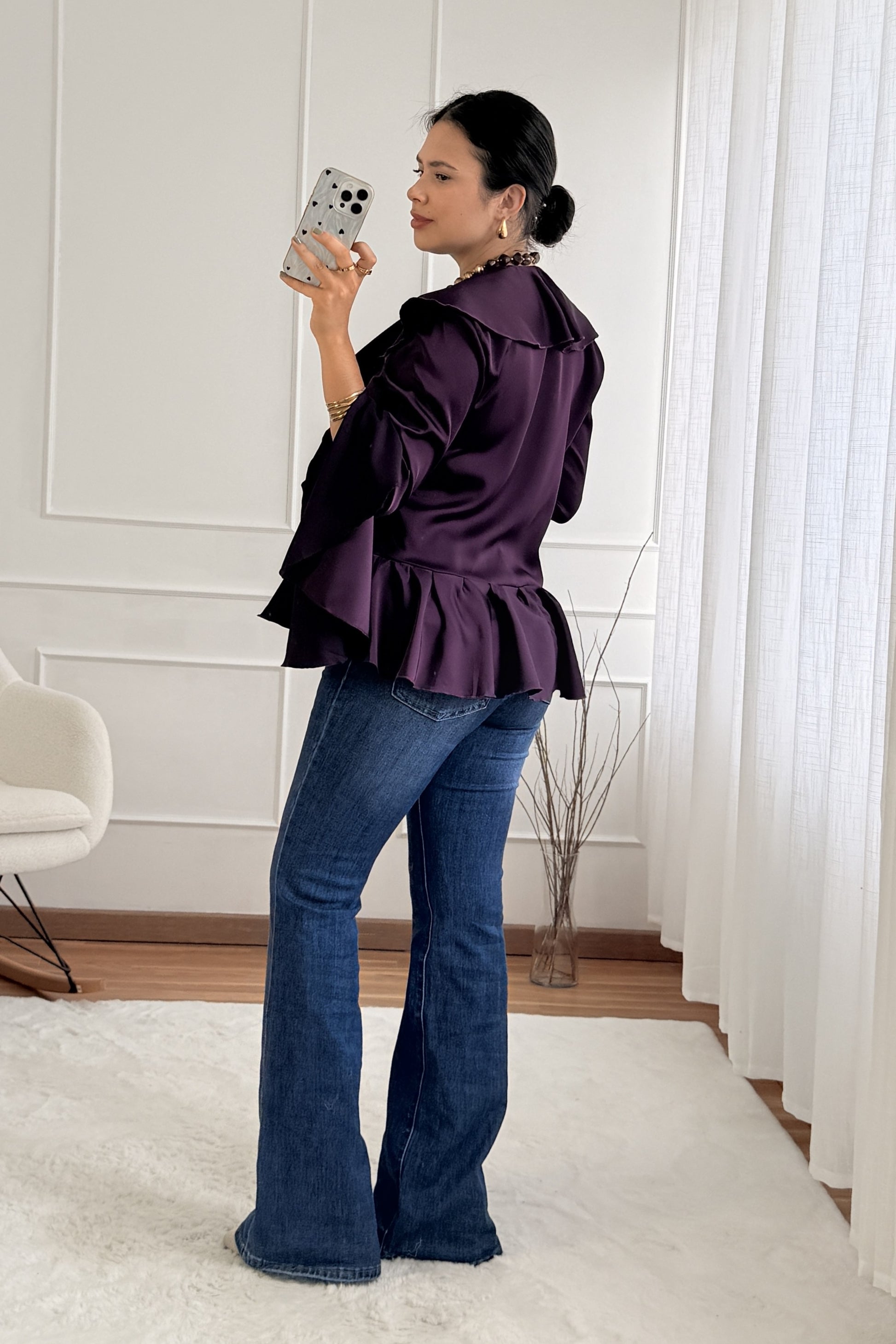 Blusa em cetim com decote em V e folhos frontais. Inclui laço ajustável no centro e mangas largas com camadas fluídas, para um visual sofisticado e elegante.