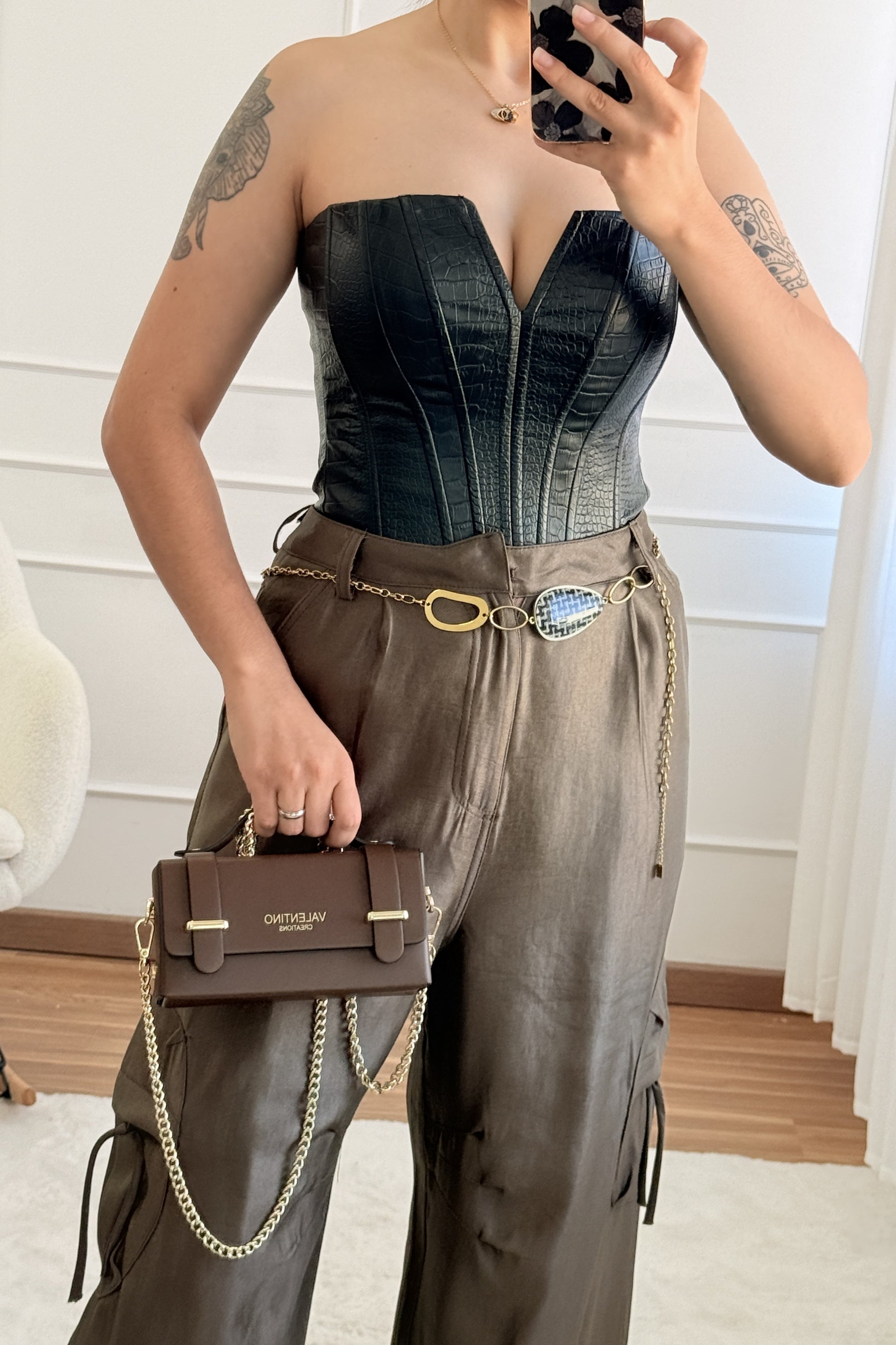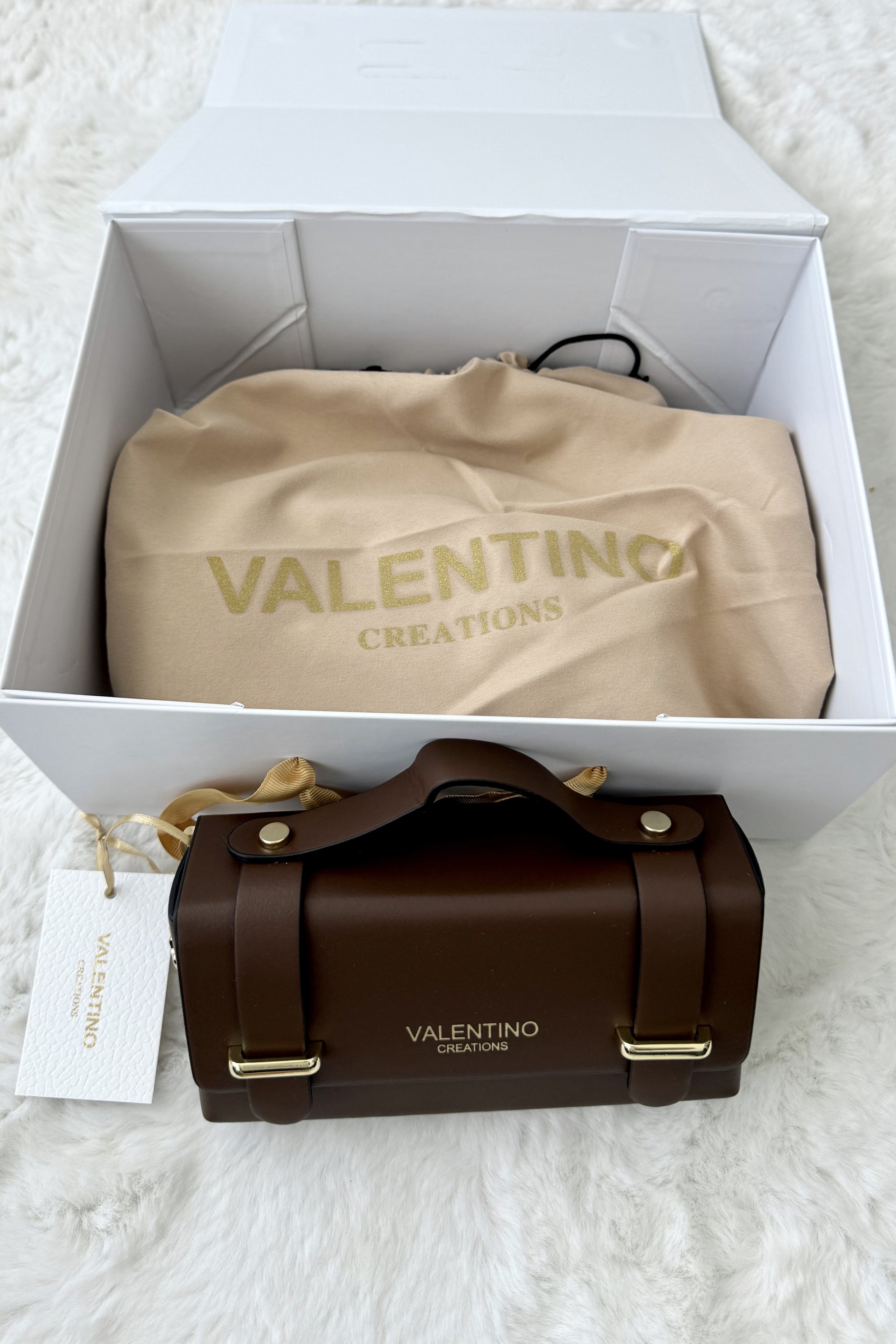 Bolsa Valentino em pele com fecho de aba. Interior em vermelho contrastante e alça longa em corrente metálica. Acompanha embalagem de apresentação elegante.