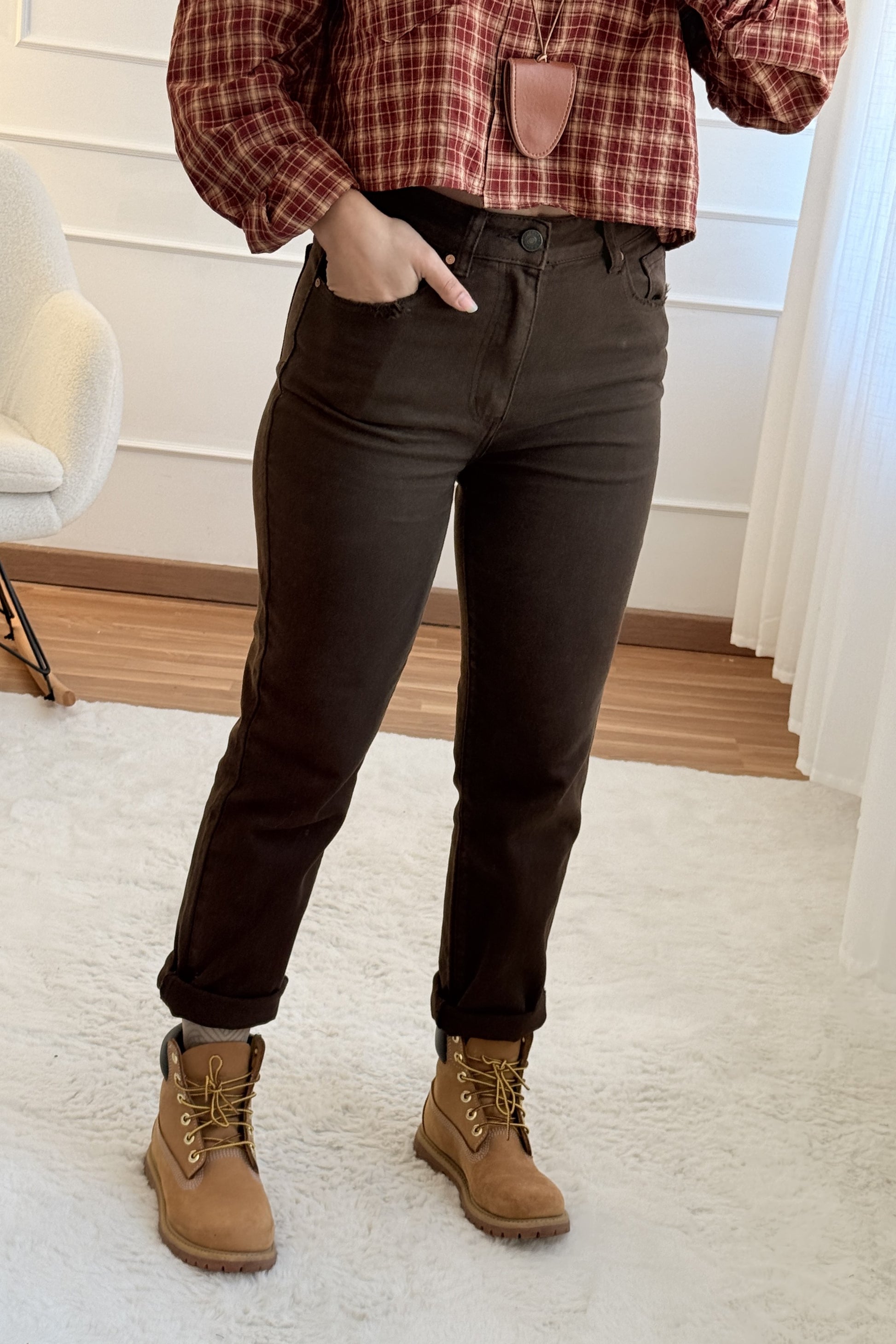 Calças de cintura média/alta, corte reto, fáceis de combinar no dia a dia.