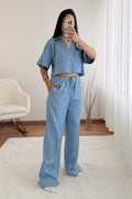 Calças de ganga largas com tecido macio e cintura elástica. Estilo casual com máximo conforto.