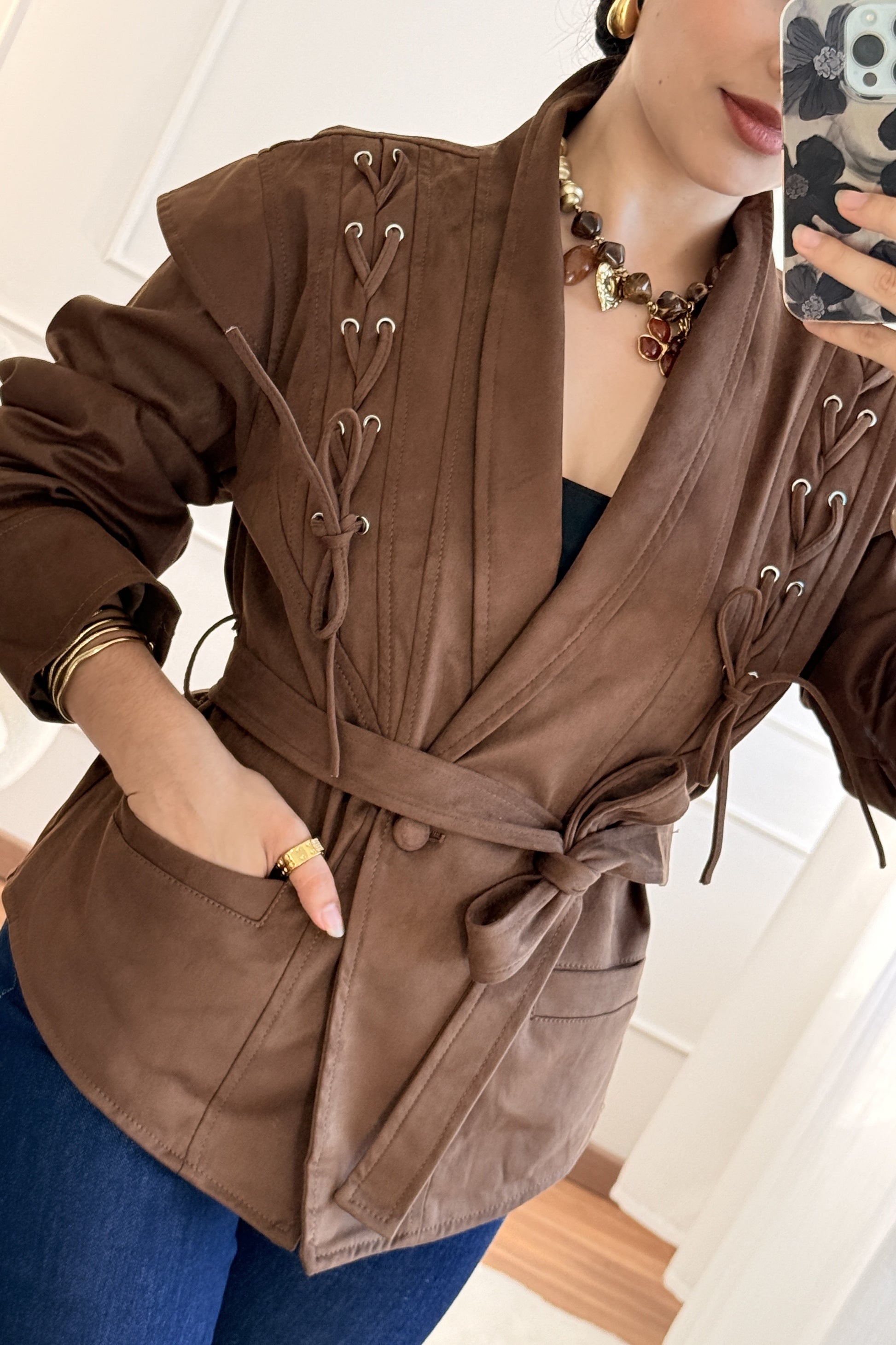 Casaco em camurça suave, com corte estruturado e detalhe de cordão aplicado nos ombros. O modelo apresenta gola larga, mangas compridas e bolsos frontais funcionais. Cinto ajustável na cintura que realça a silhueta e acrescenta um toque elegante.