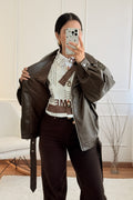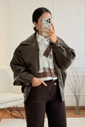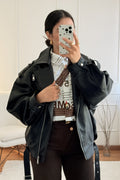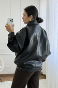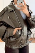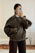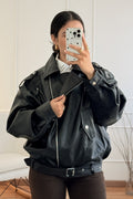 Casaco de pele oversized com design contemporâneo e corte descontraído. Apresenta fecho de correr assimétrico, bolsos frontais funcionais e lapelas estruturadas. Detalhes como bolsos com fecho, botões metálicos e cinto ajustável conferem um toque urbano e sofisticado.