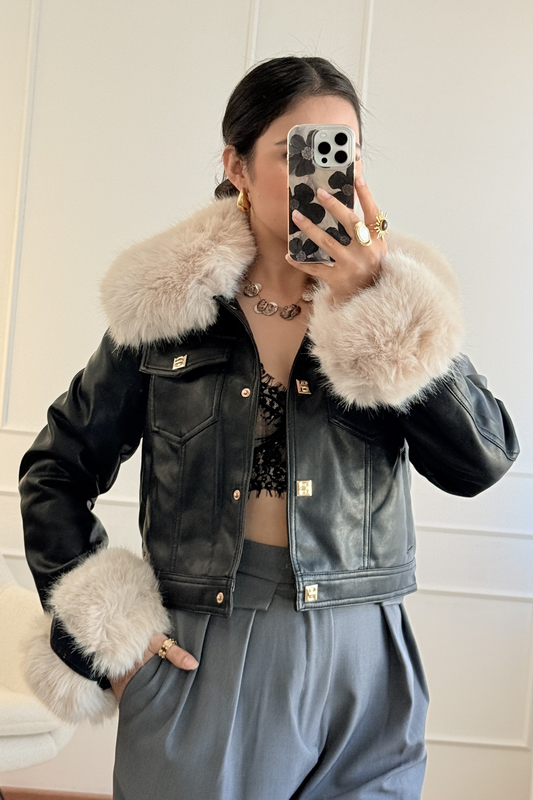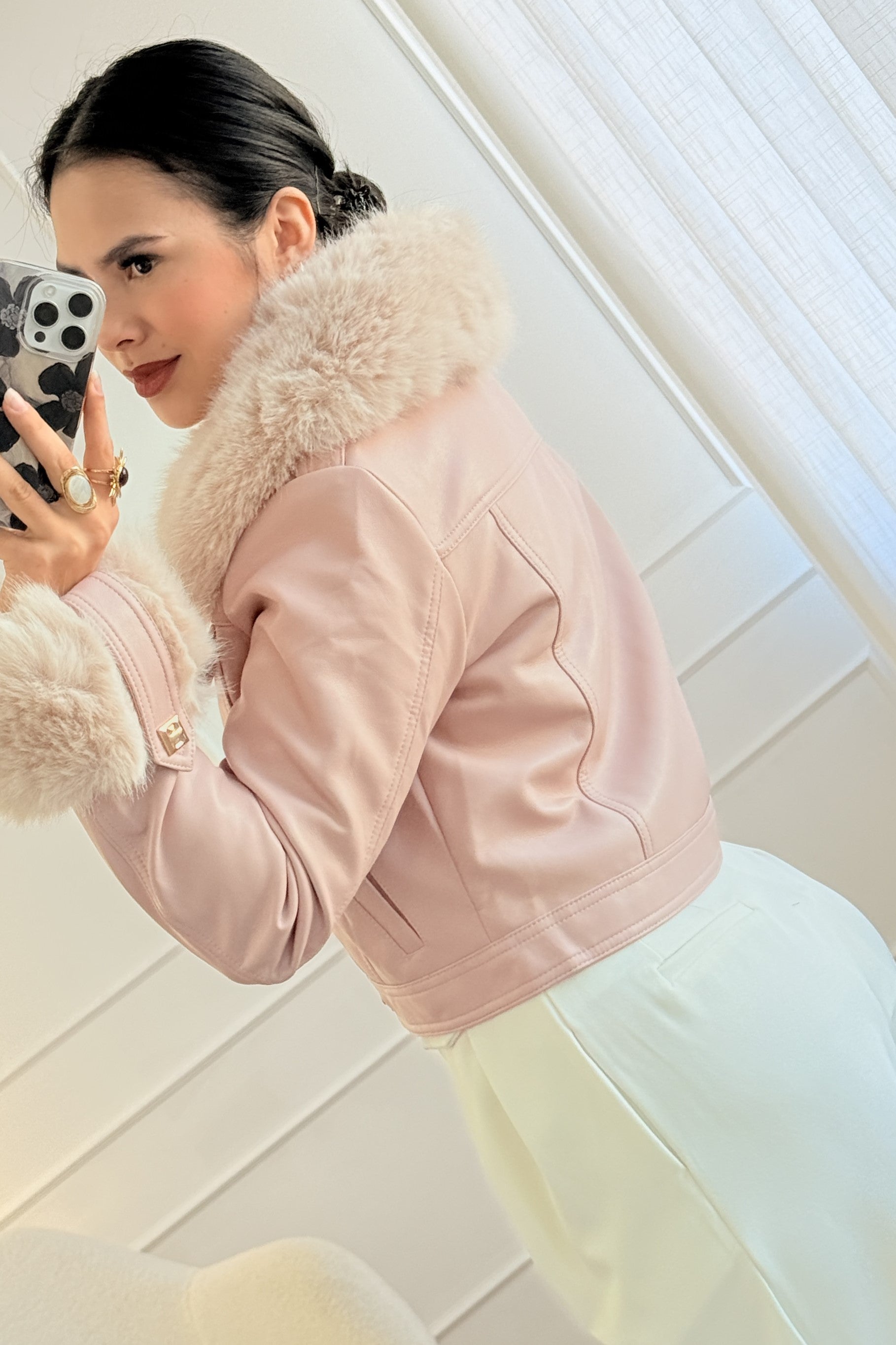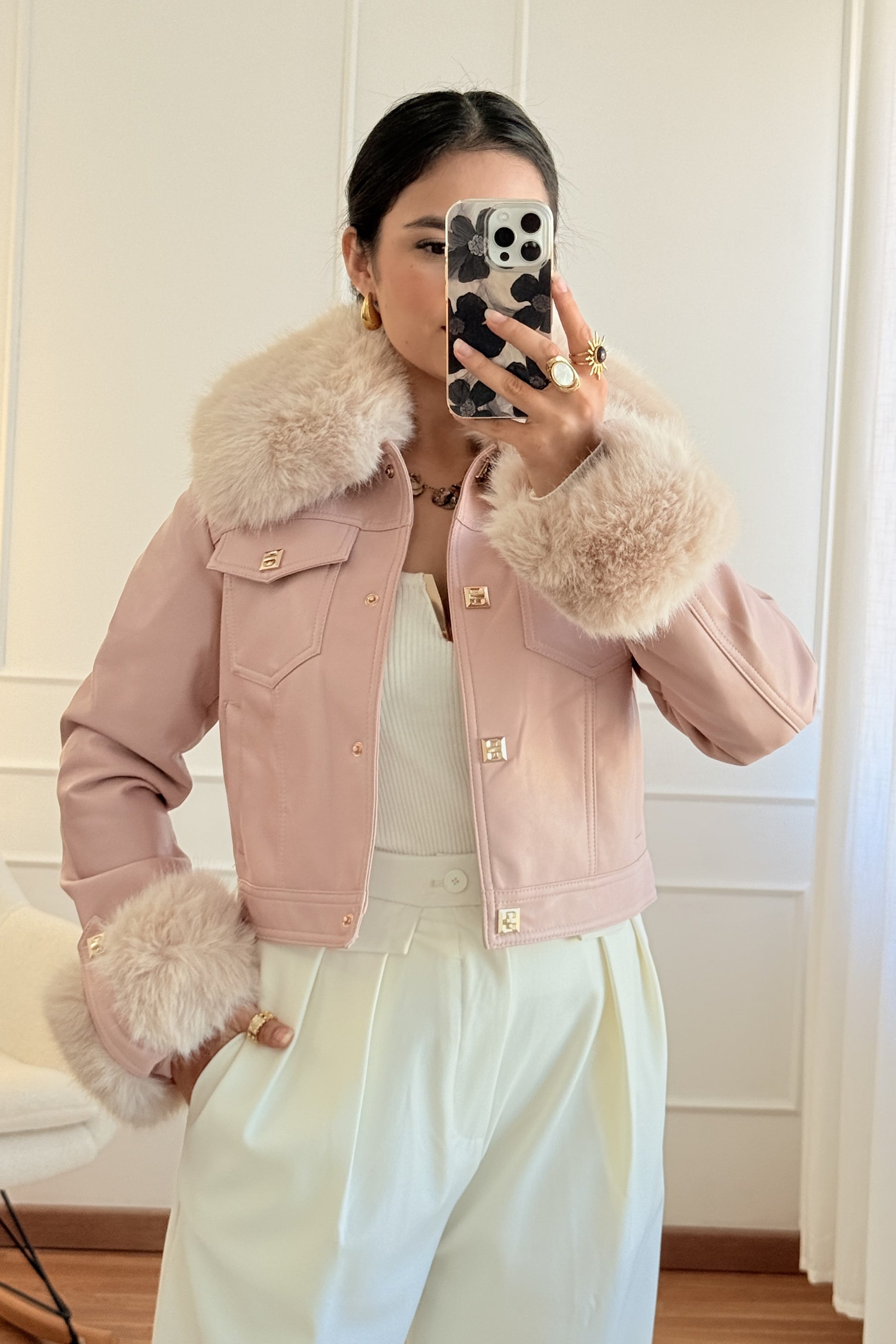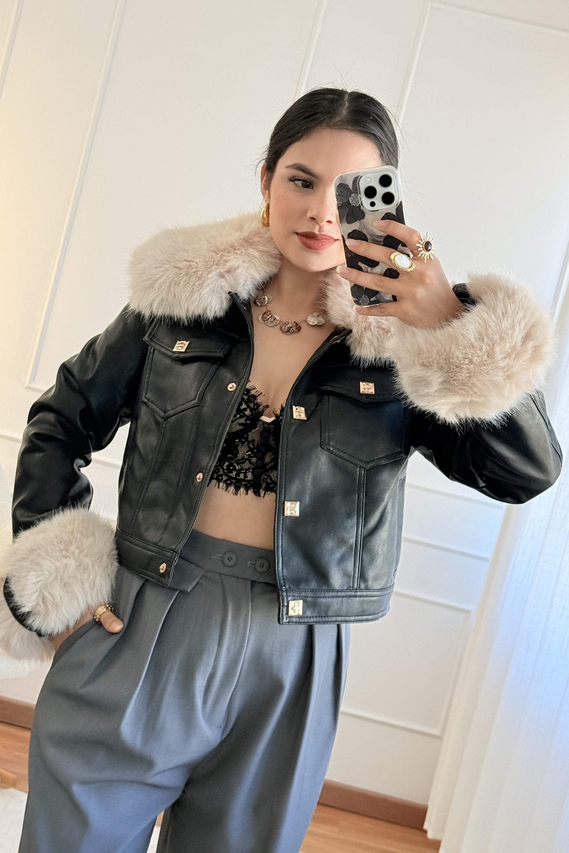Casaco de design estruturado em napa, com gola e punhos em pelo suave removível. Interior forrado também em pelo, proporcionando conforto e aquecimento. Fecho frontal com botões metálicos e bolsos de aba na parte superior.