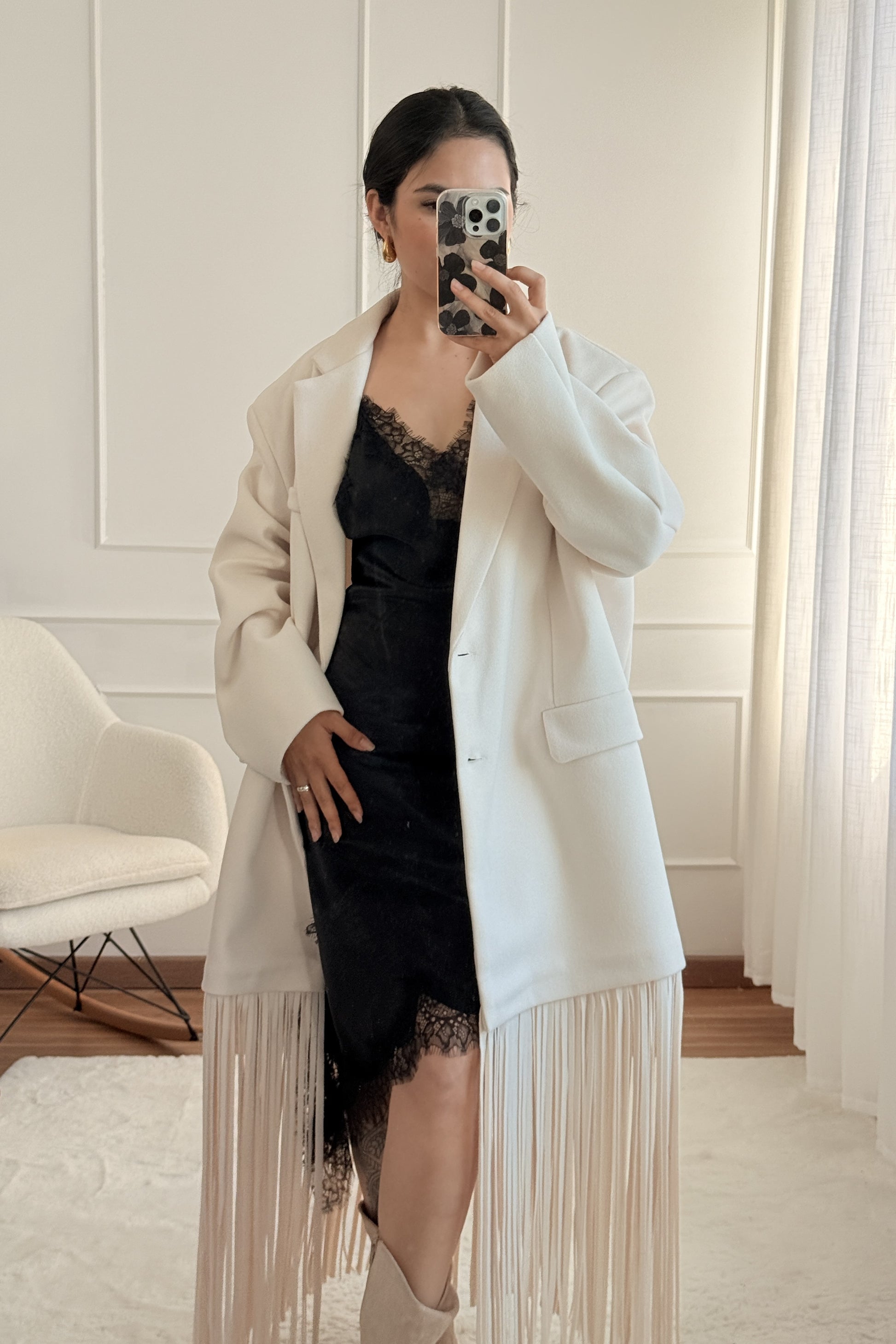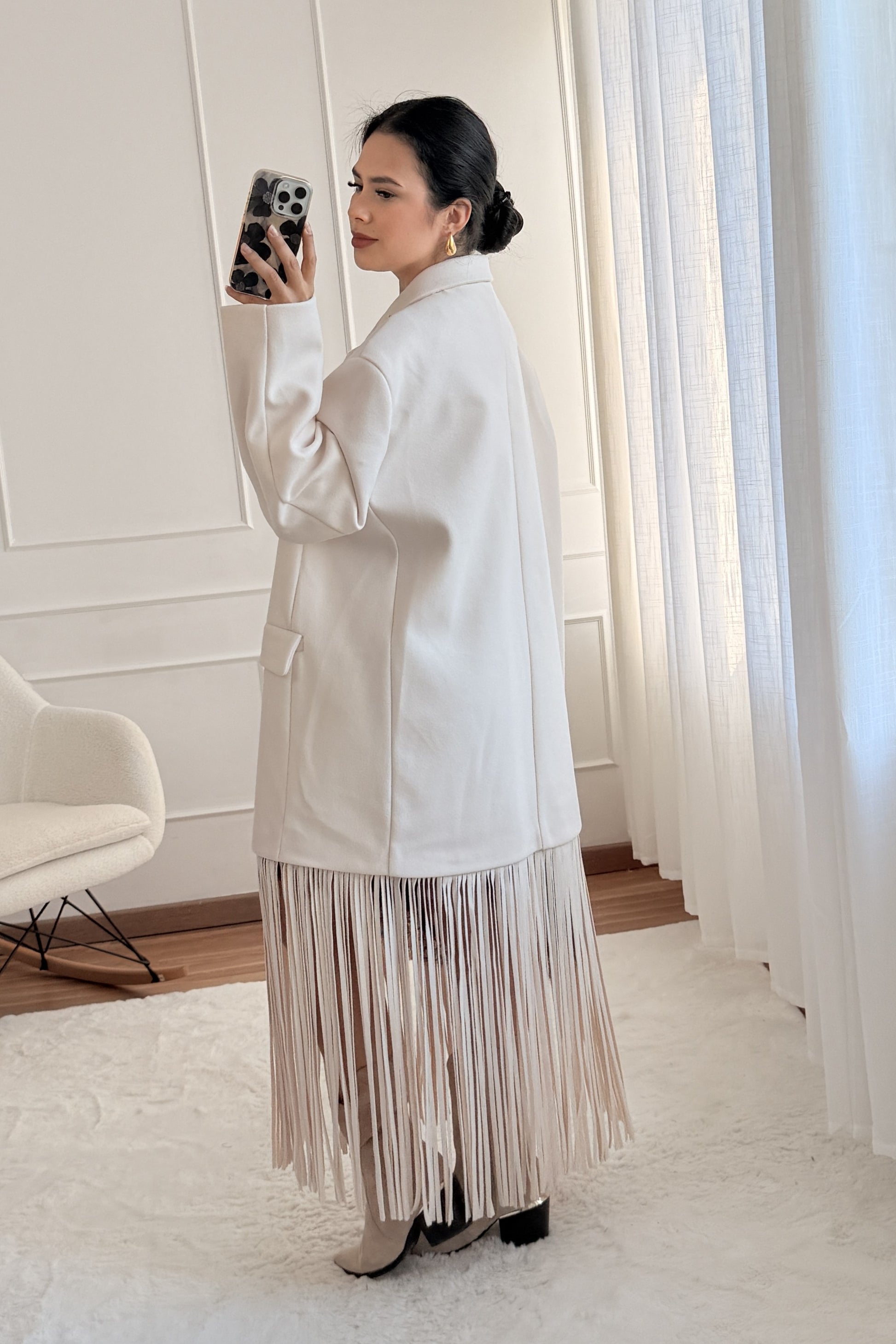 Casaco statement em poliéster, corte oversize moderno e franjas longas que trazem movimento e estilo único. Uma peça ousada e elegante, perfeita para destacar qualquer look.