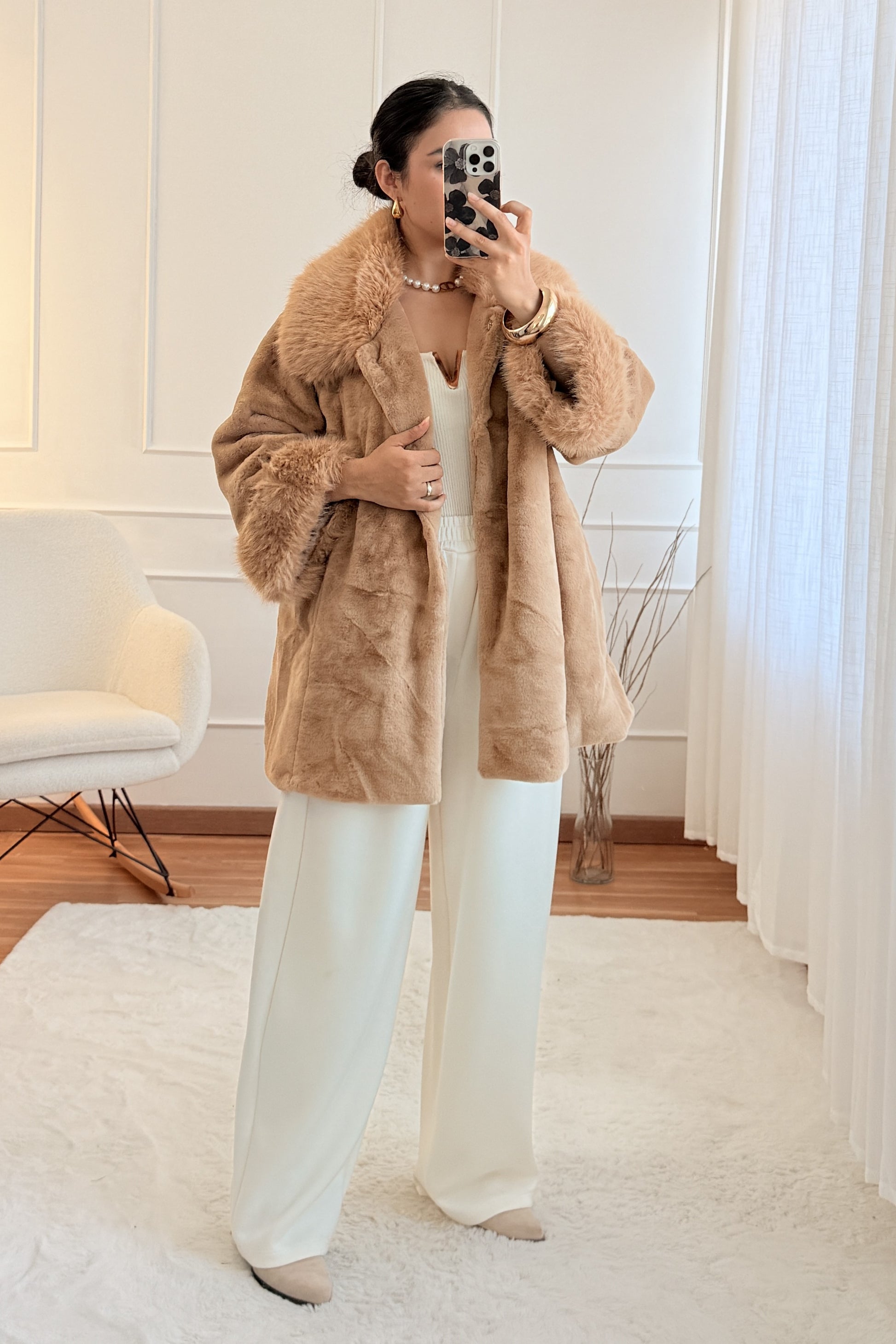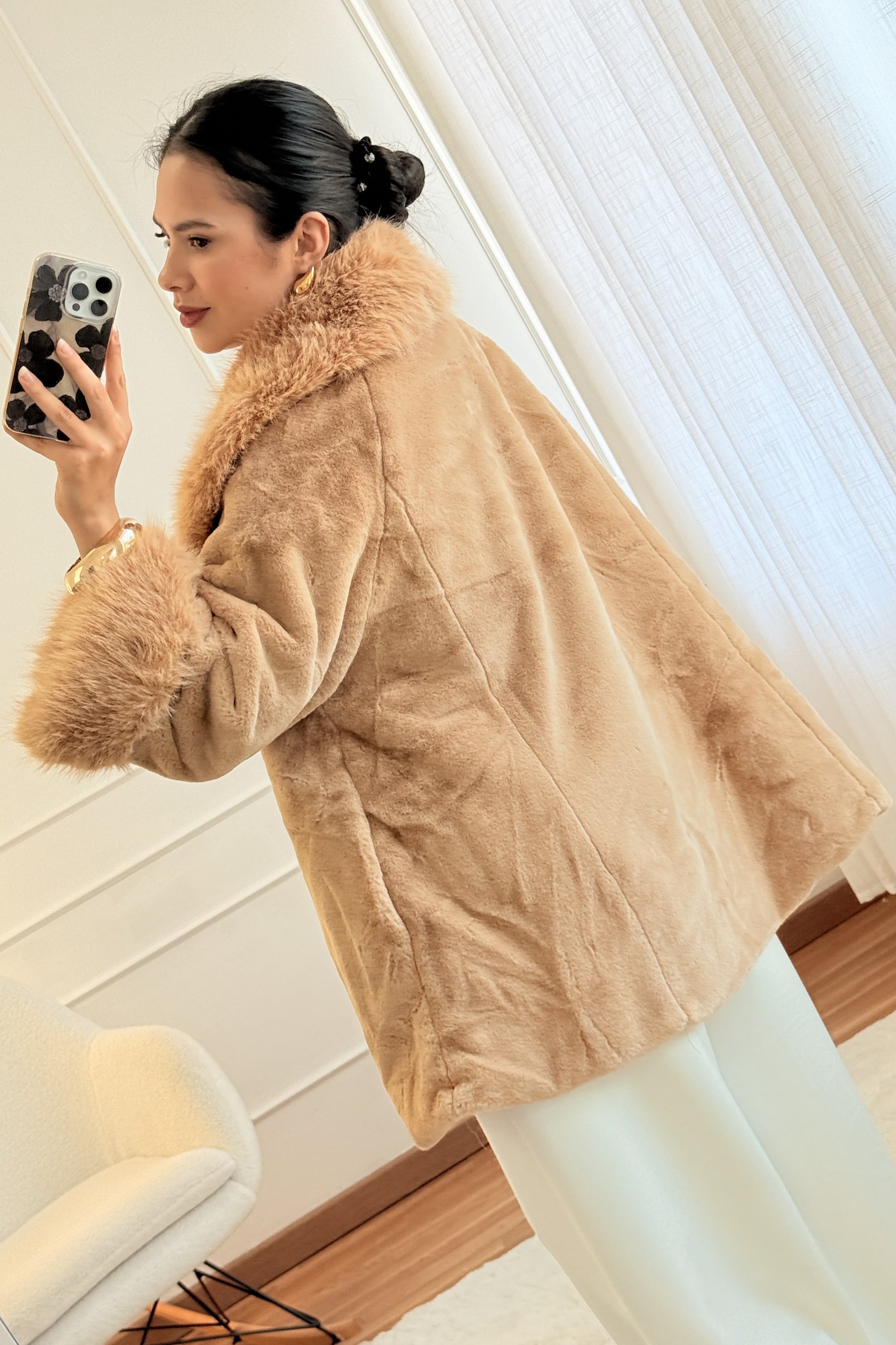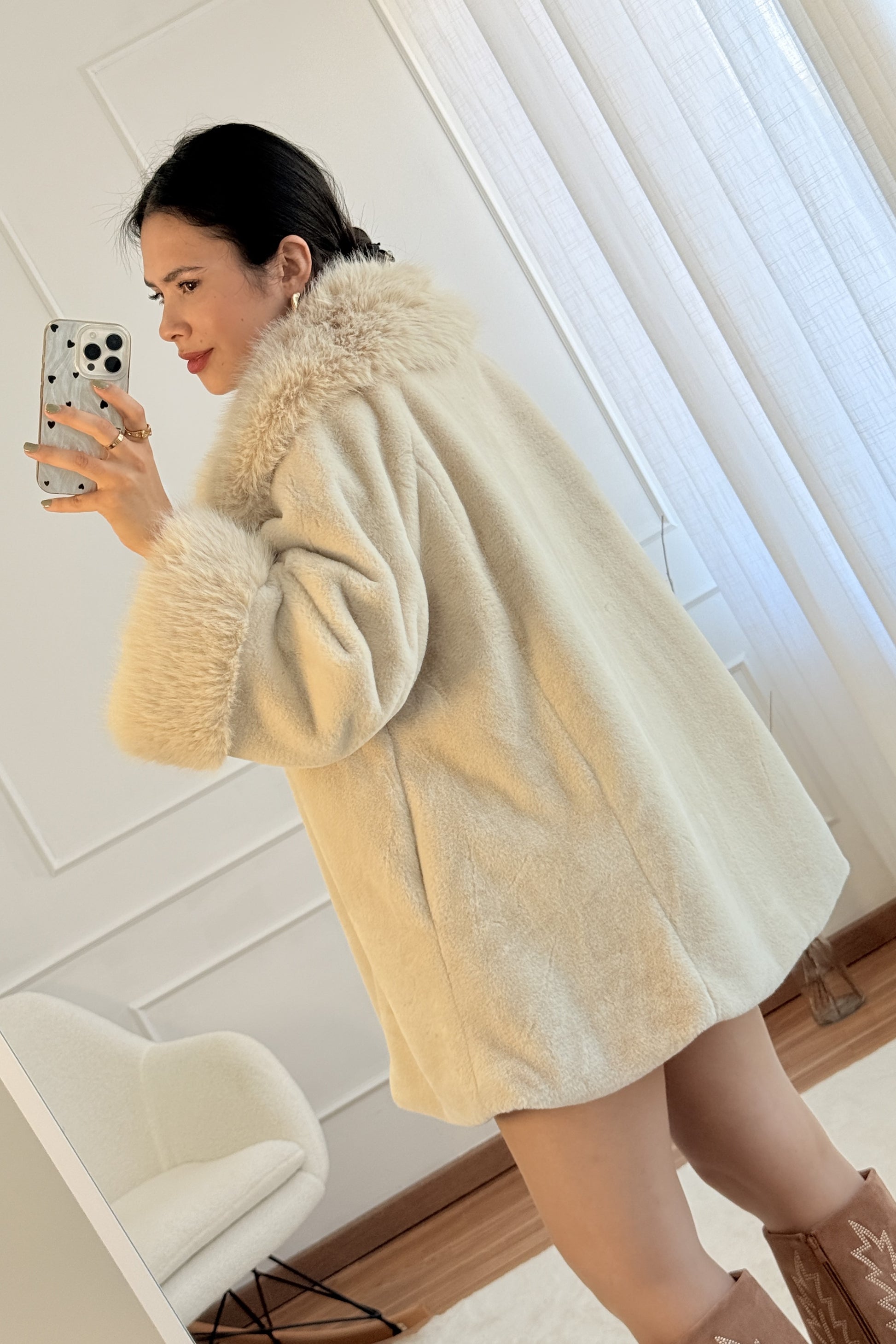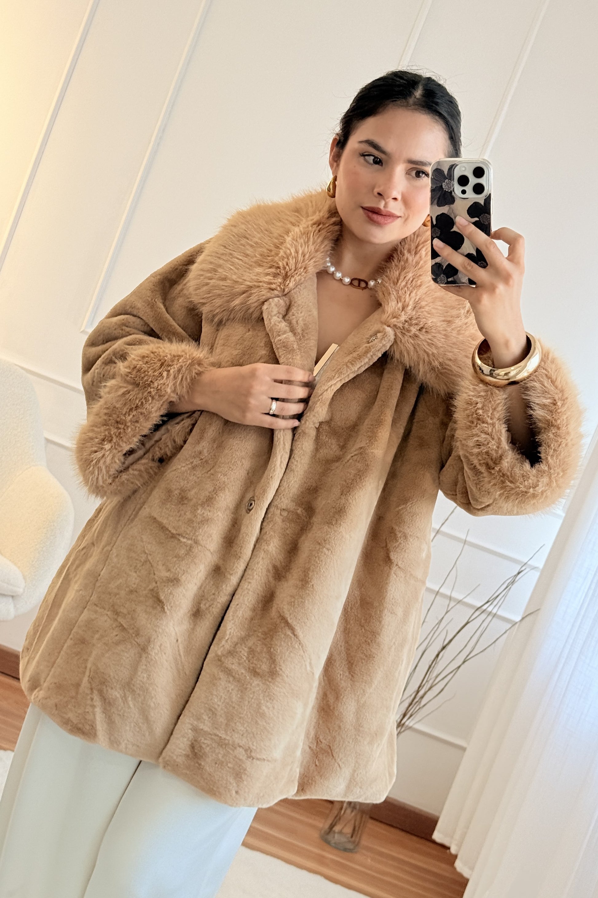 Casaco de corte reto, com gola ampla e punhos em pelo macio. Fecho frontal oculto para um acabamento elegante. Forro interior confortável,