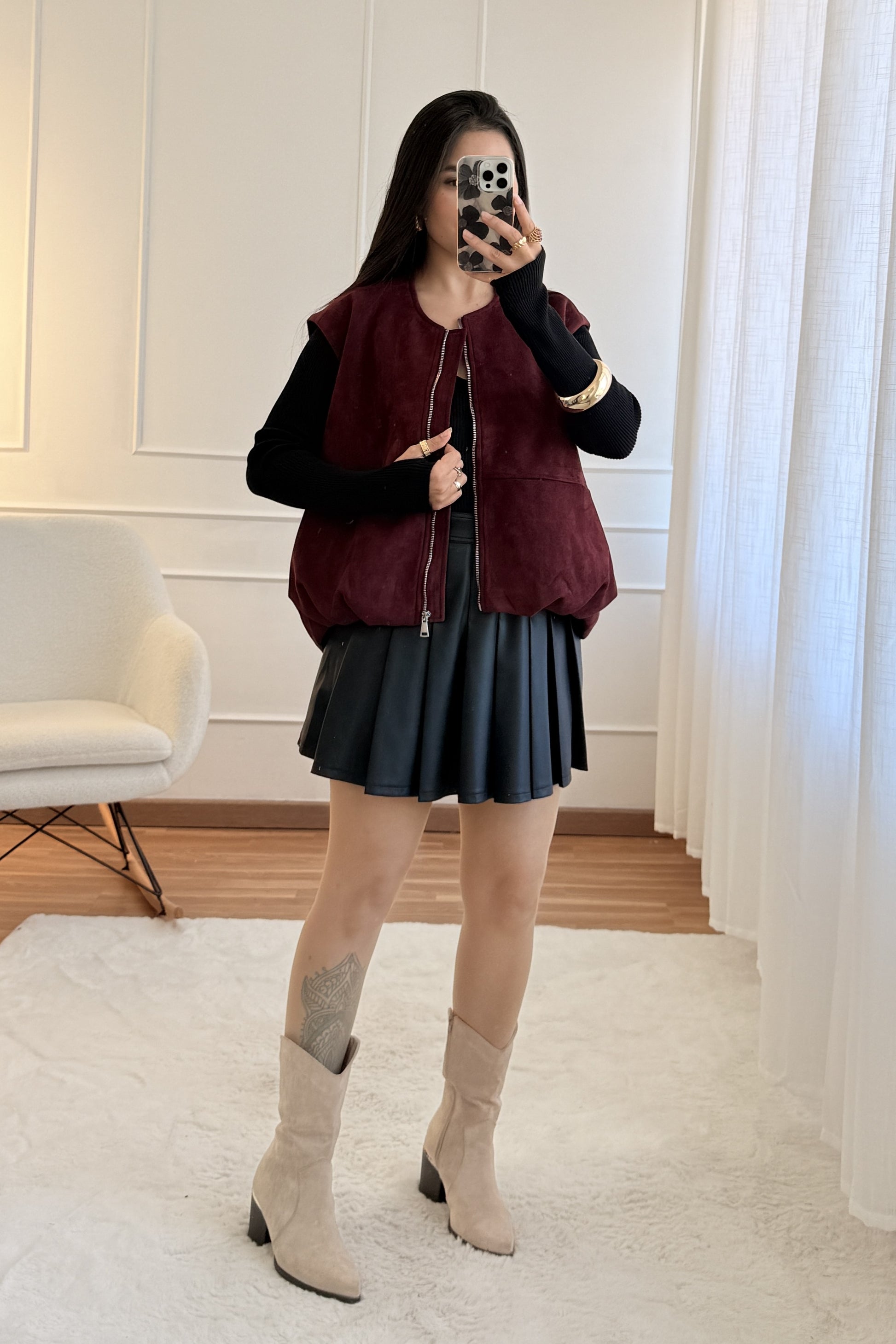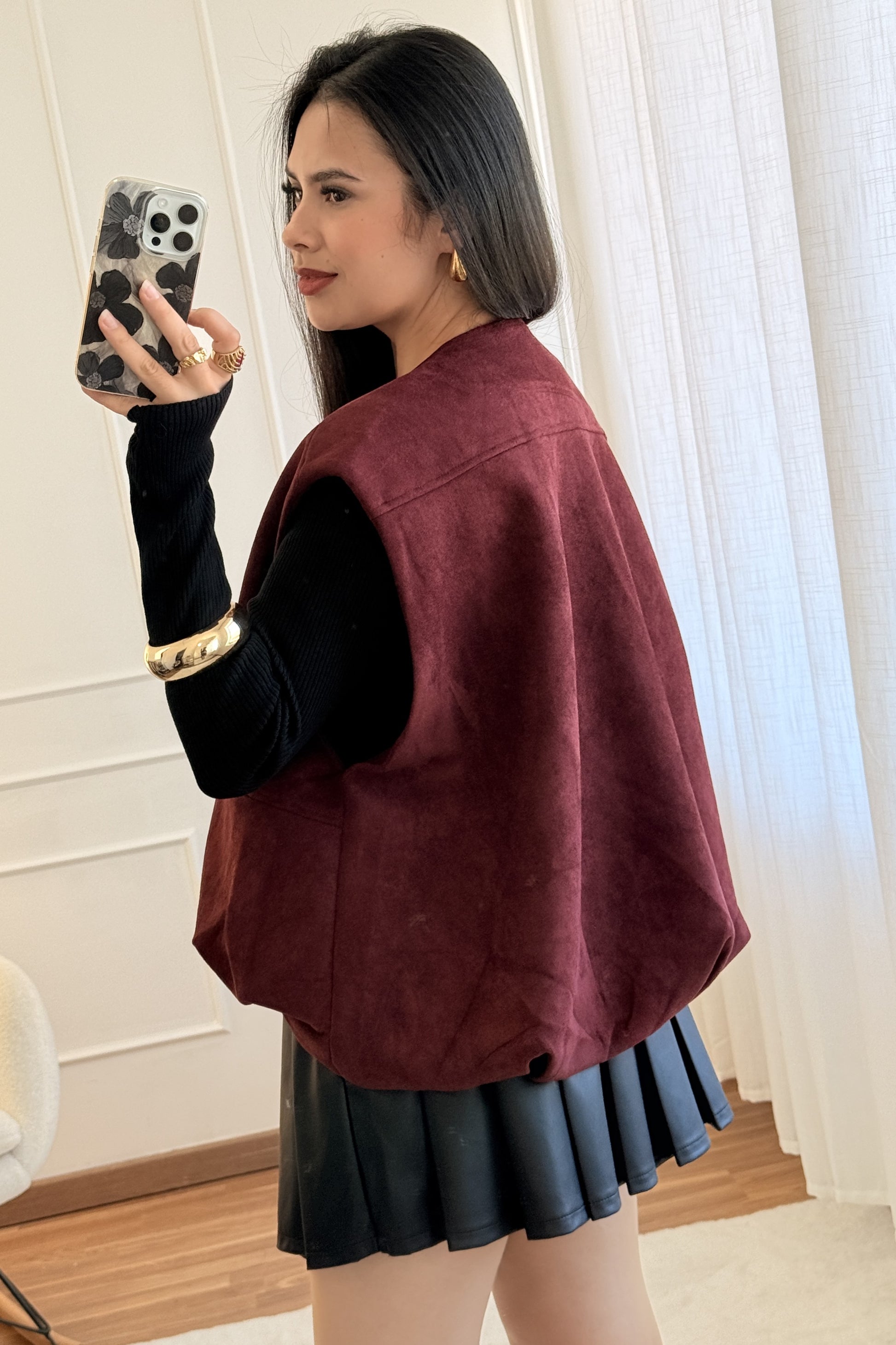 Colete em camurça de corte moderno, com fecho de correr frontal e caimento estruturado. Uma peça versátil e elegante, perfeita para sobreposições sofisticadas.