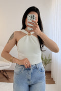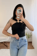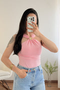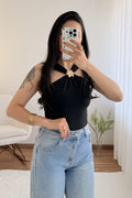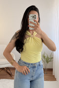 Top decorado com flor metálica na parte frontal, com almofadas de peito embutidas e tecido elástico de alta qualidade