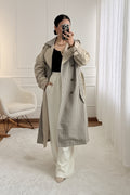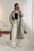 Trench coat de corte reto, com lapelas largas, fecho cruzado com botões e cinto ajustável na cintura. Detalhes clássicos nos ombros e nos punhos