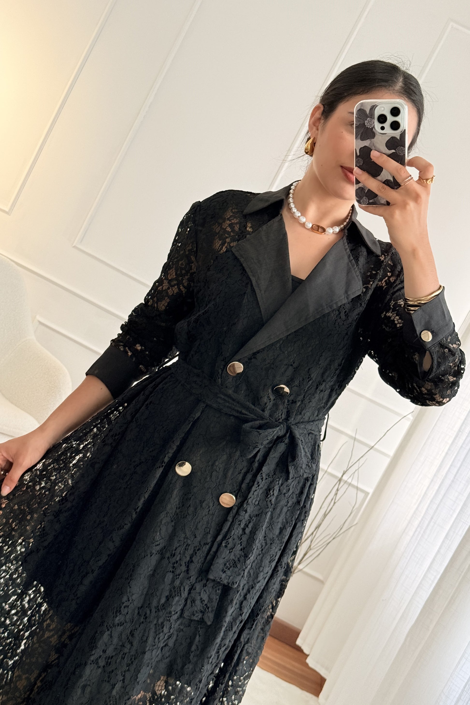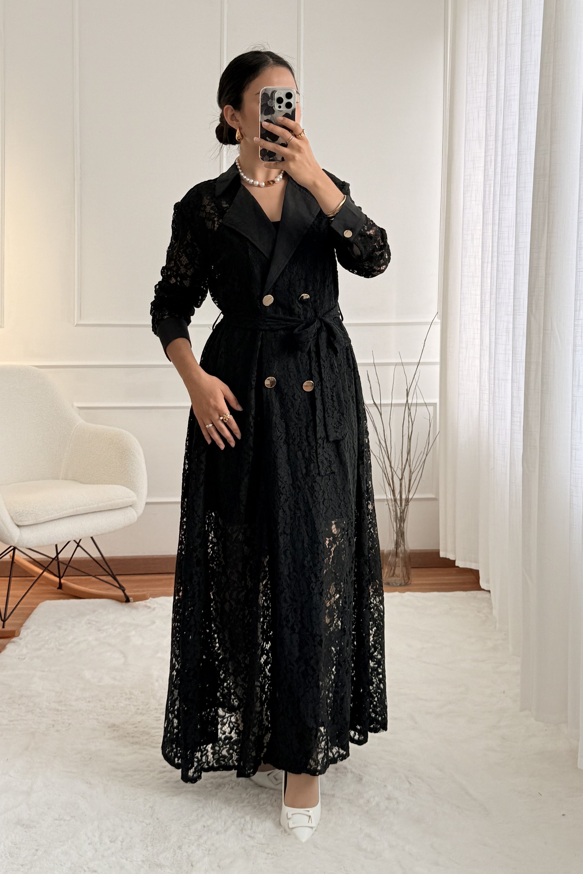 Vestido longo em renda com gola de lapela, botões frontais e cinto. Acompanha forro separado com alças reguláveis. Elegante, sofisticado e perfeito para ocasiões especiais.
