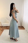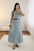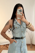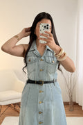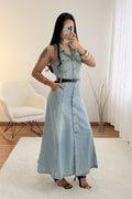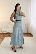 Vestido longo em ganga leve, sem mangas e com fecho de botões frontais. Bolsos no busto e cinto ajustável para marcar a cintura. Estilo casual e versátil para o dia a dia.