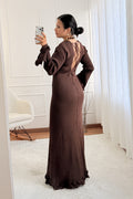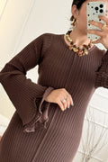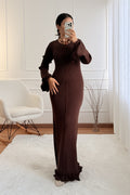 Vestido longo em malha canelada, com detalhe de decote profundo nas costas e amarração entrelaçada que realça a silhueta. As mangas compridas com acabamento ondulado e a barra fluida conferem