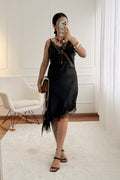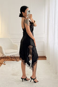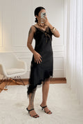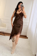 Vestido de tecido acetinado com detalhe de rendas. Alças ajustáveis. Corte assimétrico