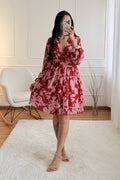 Vestido curto com estampa floral em tons de vermelho e rosa, confeccionado em tecido leve e fluído para máximo conforto e movimento. O decote em V valoriza o colo, enquanto a cintura marcada realça a silhueta de forma elegante. As mangas compridas com punhos delicados acrescentam um toque romântico