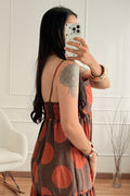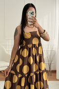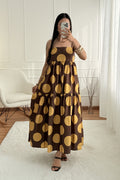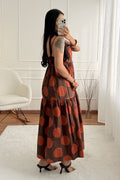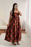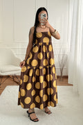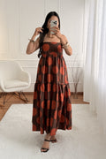 Este vestido longo feminino destaca-se pela sua estampa marcante e modelagem fluida. Com alças finas e decote reto, a parte superior valoriza o colo com elegância. A saia em camadas levemente franzidas cria movimento e leveza, enquanto o corte solto oferece conforto durante todo o dia. Perfeito para um visual descontraído com personalidade.