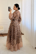 Vestido longo em tecido de viscose com padrão de leopardo, corte elegante e fluído. Apresenta mangas compridas semi-transparentes com detalhes de laços delicados e cintura marcada que valoriza a silhueta. O fecho frontal em botões dá um toque sofisticado ao design.