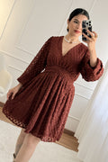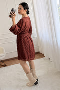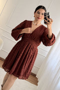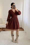 Este vestido curto destaca-se pelo seu design sofisticado e delicado. Com decote em V profundo e mangas compridas, combina feminilidade com modernidade. O tecido leve com textura floral em relevo acrescenta um toque romântico e elegante, perfeito para eventos formais, jantares ou ocasiões festivas. O corte fluido garante movimento e conforto, realçando a silhueta de forma subtil e refinada.