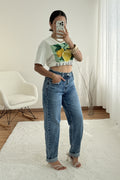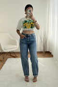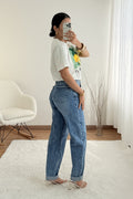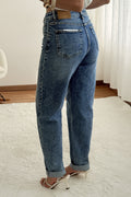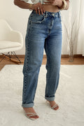 Calças de ganga com corte reto e cintura subida. Detalhe dobrado na bainha para um toque descontraído.