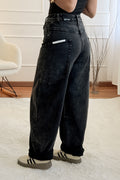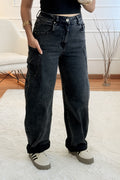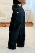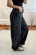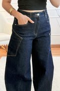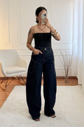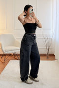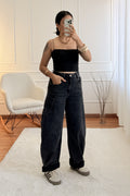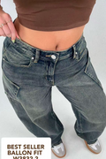 Calça de ganga feminina balloon fit em tendência, com cintura média-alta que valoriza a silhueta e perna ampla em corte arredondado, unindo conforto e estilo urbano; peça versátil e moderna