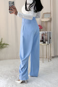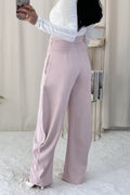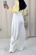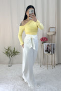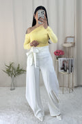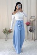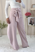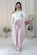 Pantalón de corte único con tejido diferente, tiro alto y lazo en forma de mariposa en la cintura.