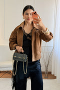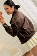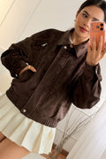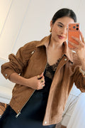 Casaco em camurça sintética macia, com fecho de correr frontal e detalhes em botões metálicos. Corte moderno e ligeiramente solto, perfeito para looks casuais e elegantes.
