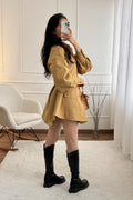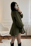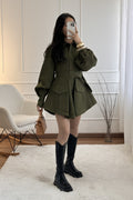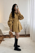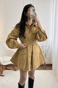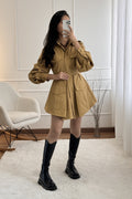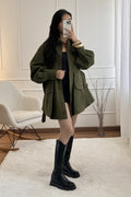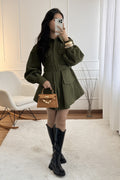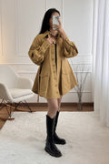 Este casaco feminino combina elegância e funcionalidade num design de inspiração utilitária. Apresenta corte ligeiramente evasé que valoriza a silhueta, mangas volumosas com punhos abotoados e gola clássica. Os bolsos frontais amplos oferecem praticidade e estilo, enquanto o cinto ajustável realça a cintura, permitindo diferentes formas de uso