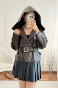 Este casaco curto em material sintético oferece um visual marcante e moderno. Com um capuz amplo e uma silhueta estruturada, destaca-se pelo cinto ajustável com fivela decorativa que valoriza a cintura e adiciona um toque sofisticado à peça. Perfeito para compor looks urbanos ou casuais com atitude, é uma escolha prática e estilosa para os dias mais frescos.