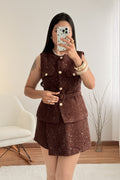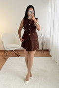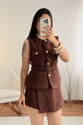 Colete em tecido tweed, com detalhe de botões decorativos dourados e bolsos falsos no peito. Acompanha um cinto no mesmo tecido que marca a cintura e realça a silhueta, criando um visual sofisticado e feminino. Ideal para conjugar com a saia-calção a combinar ou usar de forma independente.