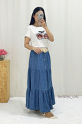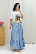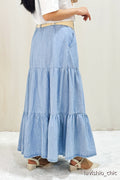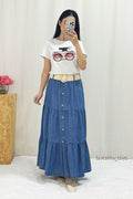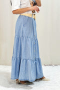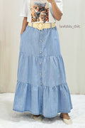 Esta falda vaquera de tres capas se acompaña de un cinturón de tela trenzada, que resalta la cintura y aporta un toque chic. Las capas crean un efecto voluminoso y fluido. Perfecto para quienes buscan una combinación de elegancia casual y detalles modernos.
