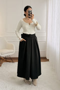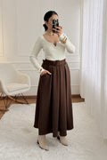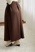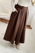 Saia A-line com pregas, bolsos laterais e cinto incluído. Cintura ajustável