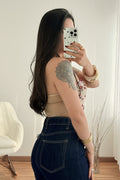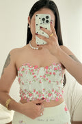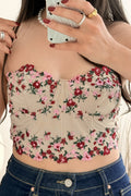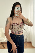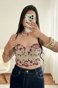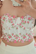 Top bustier con ballenas, en tejido bordado con rosas. Su delicada estructura realza la silueta con un toque romántico y femenino.