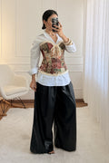 Top estilo corset em tecido estruturado com padrão decorativo. Possui copas incluídas para maior suporte e detalhe de espartilho ajustável nas costas, garantindo conforto e valorizando a silhueta.