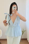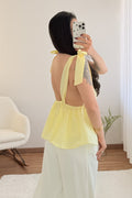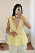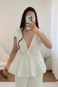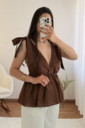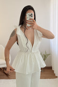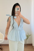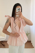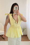 Top con escote en V pronunciado , corte ajustado , bajo con volantes y espalda abierta . Los tirantes permiten hacer un delicado lazo , dándole un toque romántico .