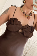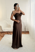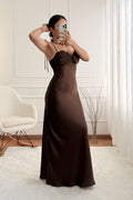 Vestido longo em cetim de caimento suave, com alças finas ajustáveis e detalhe trabalhado na zona do busto que acrescenta um toque romântico e delicado.