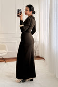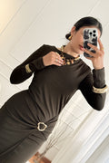 Vestido elegante em tecido fluido, manga comprida, detalhe de fivela na cintura e racha frontal. Perfeito para ocasiões especiais.