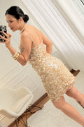 Vestido curto totalmente coberto de lantejoulas, com alças finas e fecho invisível na lateral. Modelo elegante e sofisticado, ideal para ocasiões especiais.
