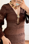 Este vestido curto de renda com manga comprida é a escolha perfeita para quem procura sofisticação e feminilidade. O decote em V com detalhe decorativo acrescenta um toque distinto, enquanto as camadas em renda criam movimento e delicadeza.