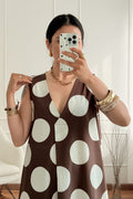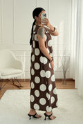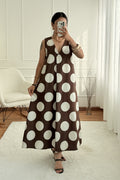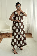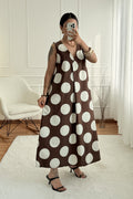 Destaque-se com este vestido longo de corte evasé e padrão clássico de bolinhas. O modelo sem mangas e com decote em V profundo valoriza a silhueta de forma leve e elegante. A estrutura solta garante conforto durante todo o dia, sendo uma escolha ideal para dias quentes, passeios descontraídos ou eventos de verão. Uma peça versátil e atemporal, perfeita para conjugar com sandálias de tiras e acessórios marcantes.