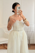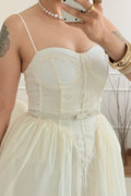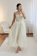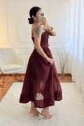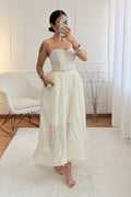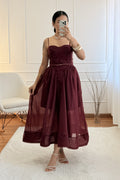 Este vestido feminino combina sensualidade e sofisticação através do seu corpete estruturado com alças finas e da saia fluida que proporciona movimento e leveza. O detalhe cintado realça a silhueta, enquanto a saia comprida cria um visual romântico e sofisticado.Perfeito para ocasiões especiais, casamentos, festas ou jantares elegantes,