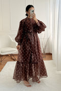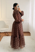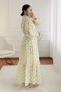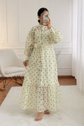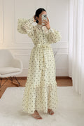 Vestido longo com estampa de bolinhas e mangas bufantes, com corte reto e faixa ajustável na cintura. Gola alta com botões frontais e babado fluido na barra. Um modelo elegante com toque vintage, perfeito para looks leves, femininos e atemporais.