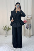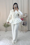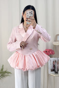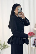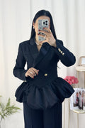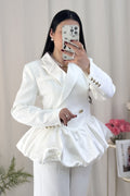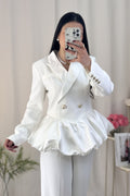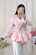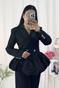 Blazer ajustado com design único, barra em formato de balão e fecho invisível nas costas, estilo sofisticado e elegante.
