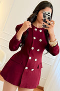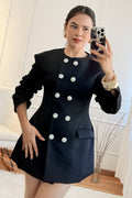 Blazer curto estruturado com fecho cruzado e botões decorativos em relevo. Modelo elegante com bolsos frontais de aba, ideal para um look sofisticado e moderno.