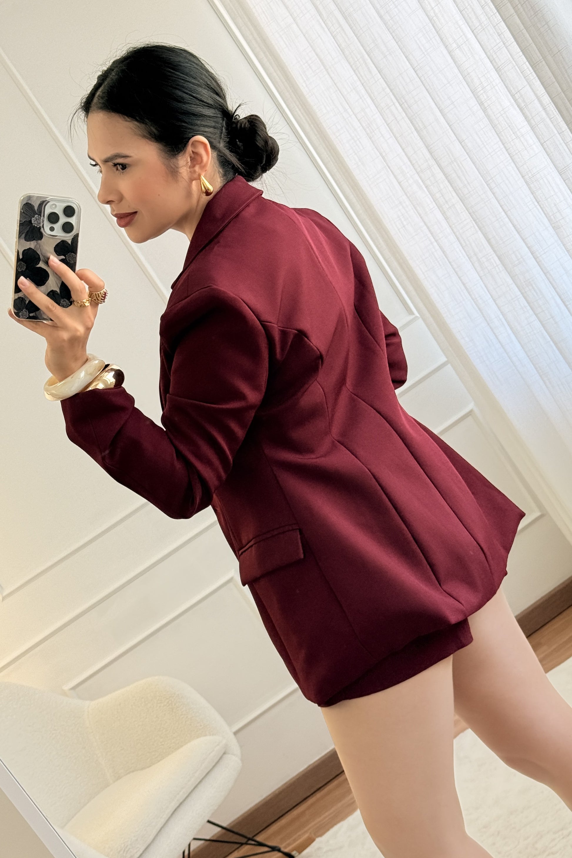 Blazer de corte elegante, com lapela clássica e fecho frontal em botões dourados texturizados. Bolsos laterais com aba. Estrutura leve com toque de elastano para maior conforto.