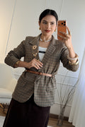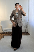 Blazer em padrão pied-de-poule, com corte clássico e elegante. Inclui cinto no mesmo tecido para marcar a cintura. Tecido com ligeira elasticidade para maior conforto.