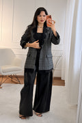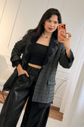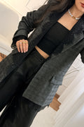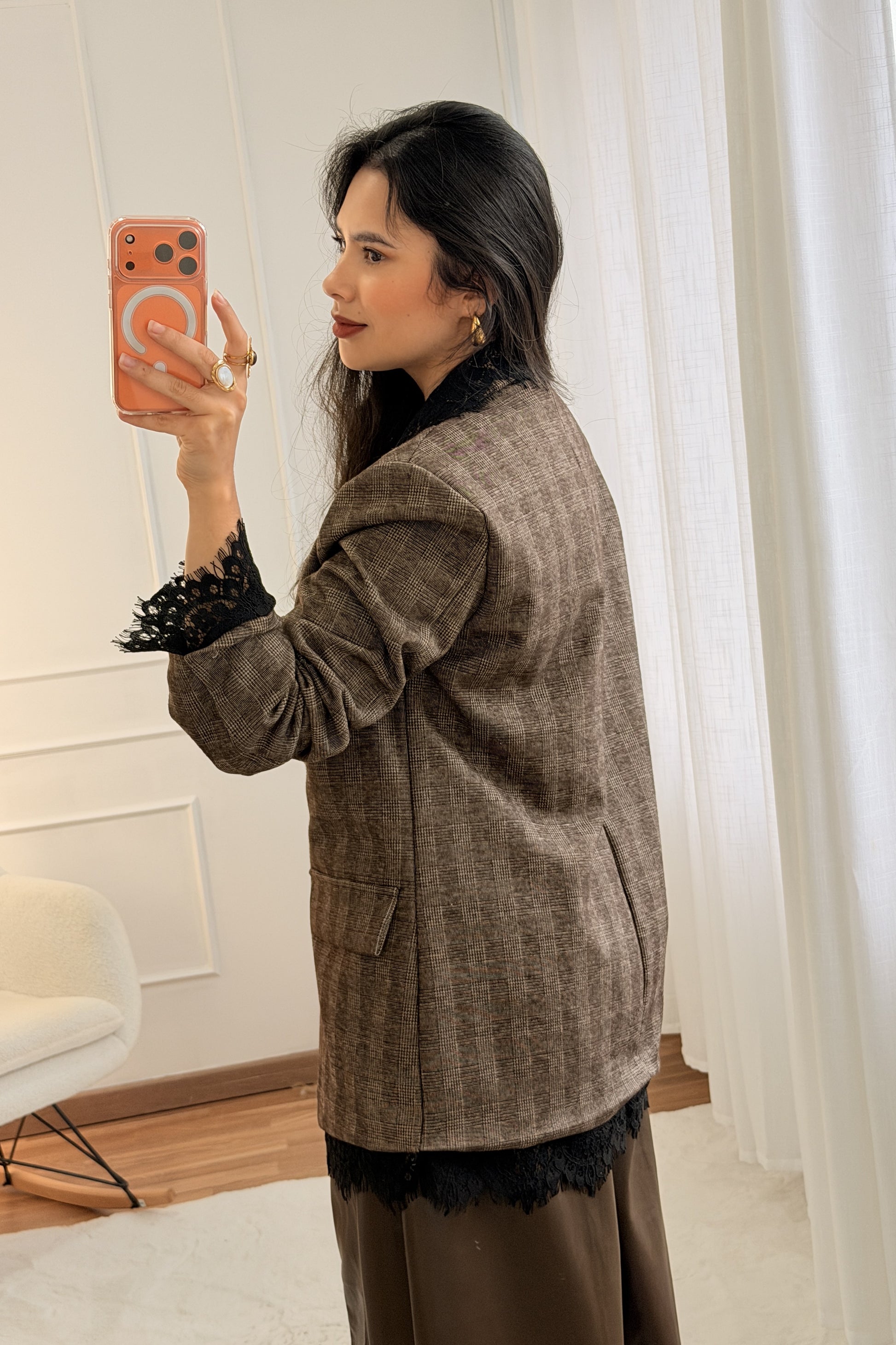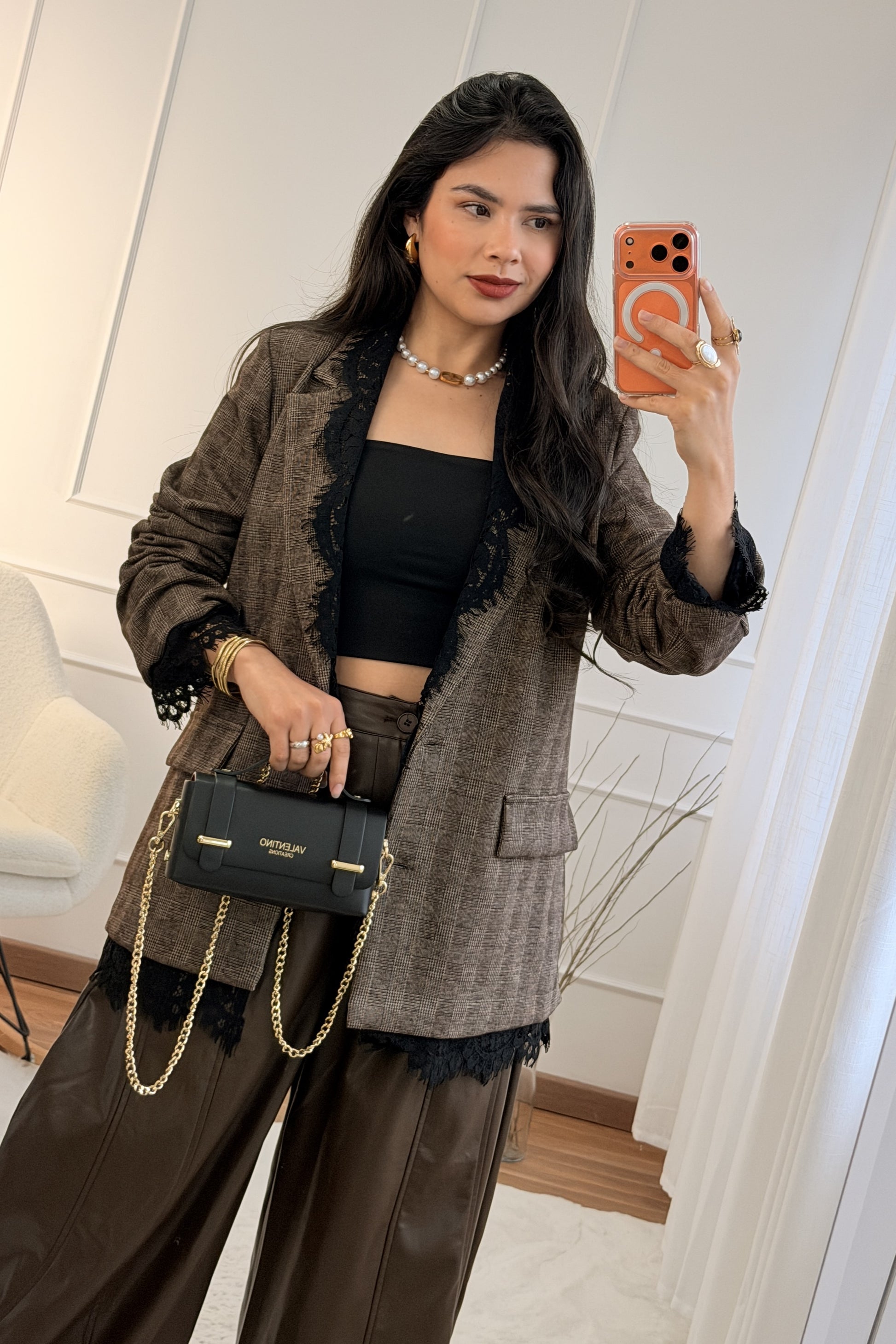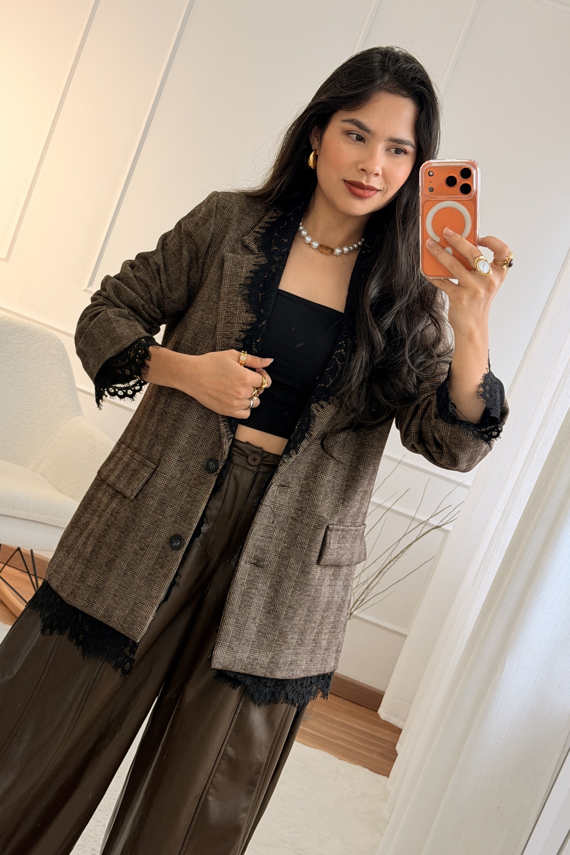 Blazer de corte clássico com detalhes delicados em renda no colarinho, punhos e barra. Uma peça elegante e versátil que combina sofisticação com um toque feminino. O tecido estruturado oferece um caimento perfeito, ideal para compor looks modernos e cheios de personalidade.