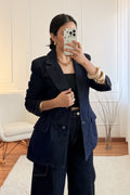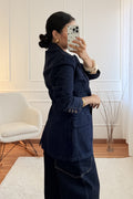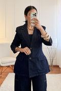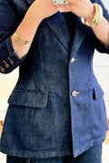 Este blazer em ganga é a escolha perfeita para quem procura sofisticação com um toque contemporâneo.Com fecho de botões na frente e bolsos de aba funcionais, oferece um design prático e elegante.A silhueta estruturada valoriza qualquer coordenado