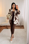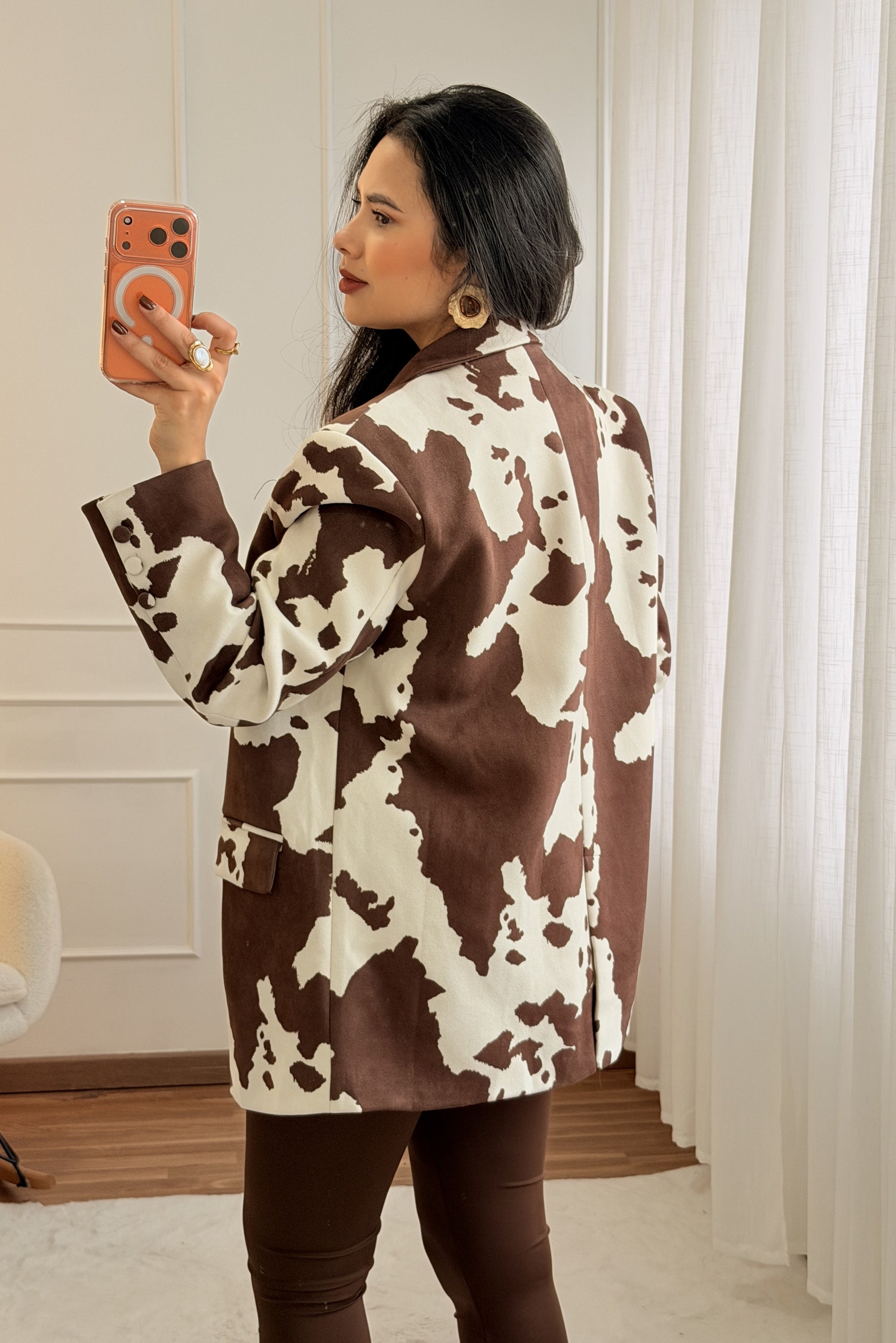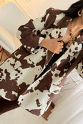 Blazer moderno e cheio de personalidade, com estampa animal print estilo “cow print” que traz um toque ousado e fashionista. O tecido tipo pele de pêssego proporciona um toque macio e confortável